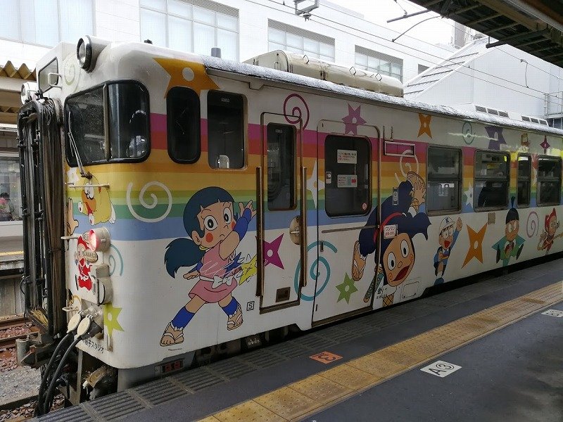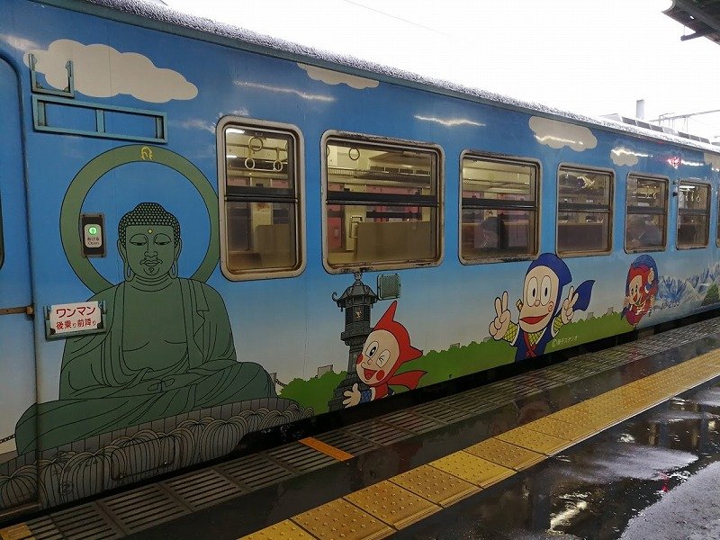 高岡駅に着いて、氷見へ向かう列車のホームに降りたとたん、どでかいハットリ君に出迎えられてびっくり。藤子不二雄A氏が富山出身なのはA氏の描いたまんが道を読んで知ってたけど、こんなに郷土とタッグを組んでいて、列車まであるなんて知らなかった。大はしゃぎしてたくさん写真を撮りました。