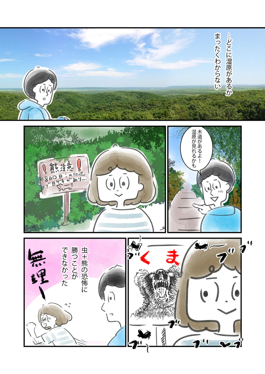 2011年北海道の旅 その6 2018年09月30日 13:00 2011年北海道の旅 その12011年北海道の旅 その22011年北海道の旅 その32011年北海道の旅 その42011年北海道の旅 その5の続きです。釧路湿原展望台から、雄大な湿原を見てみようと行ってみたわけですが、一面緑すぎてよくわからない。森の中?向こうの平なところ?それともあれは田んぼ? 木道があるので1、2キロ歩けば もっと湿原を感じられたかもだけれど、看板には熊注意。目撃情報。そして迫りくる謎の羽虫。 虫と熊による波状攻撃(熊は妄想)で恐怖でいっぱいになり、木道をちょろっと行っただけで断念。イーさんは行きたそうにしていたけれど…。虫と熊を怖がってるなら山ガールになりたいなんて2度と言うんじゃないよと怒られた。 「夫婦の非日常」カテゴリの最新記事 タグ :#2011年北海道の旅#北海道#バイク旅#山登れないガール < 前の記事次の記事 > コメント コメントフォーム 名前 コメント 記事の評価 リセット リセット 顔 星 情報を記憶 コメントを投稿する