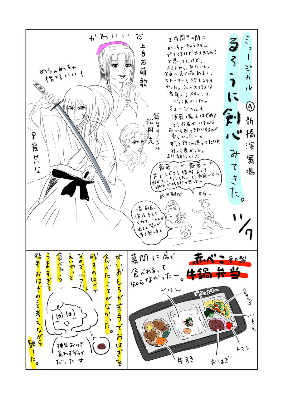 ミュージカルるろうに剣心観てきた 2018年11月08日 07:00 ミュージカルがとても面白かったのと、お弁当のおはぎが美味しくてびっくりしたのとで、とても興奮したので、キャンプ漫画の途中だけれど、ミュージカル浪漫活劇るろうに剣心レポを描きました。昨日、7日のお昼の部に行ってきた。面白いとカッコイイしか言ってないけど、ほんとにそうだったから! 「夫婦の日常」カテゴリの最新記事 タグ :#るろ剣#斎藤一 < 前の記事次の記事 > コメント コメントフォーム 名前 コメント 記事の評価 リセット リセット 顔 星 情報を記憶 コメントを投稿する