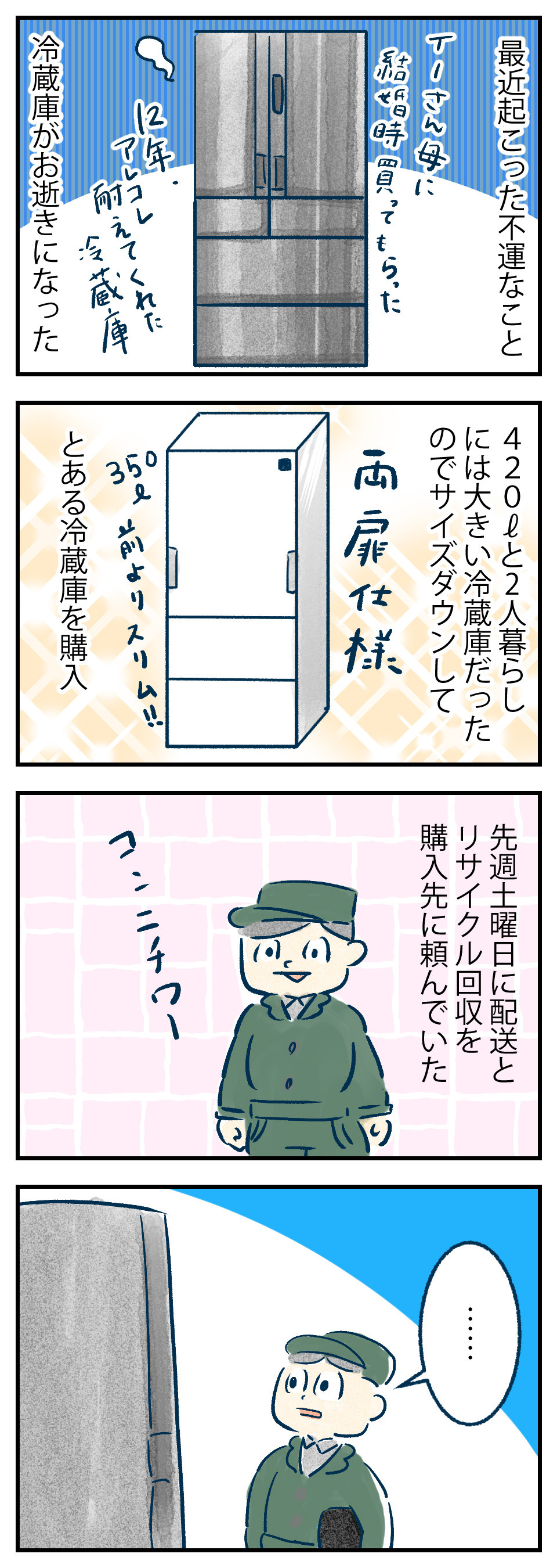 楽天で購入して、配送業者に来てもらって、リサイクル回収と同時にしたら、壊れた大きな冷蔵庫を見て、一言。