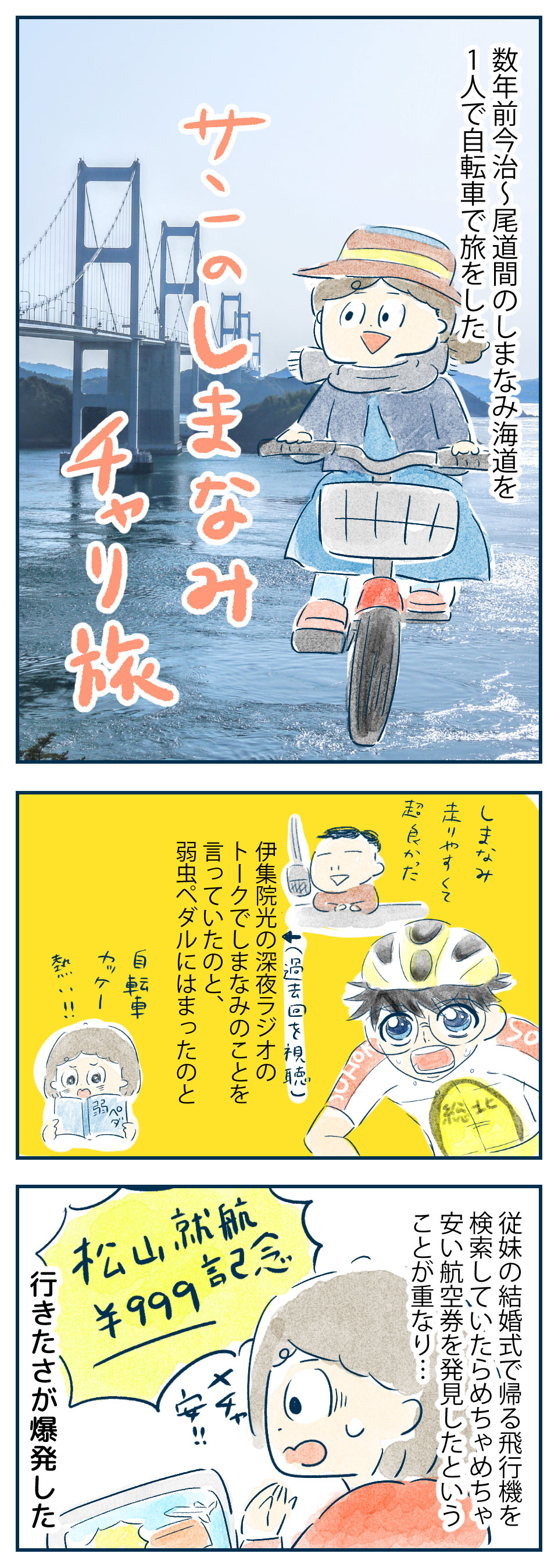 しまなみ海道のはなし1~自転車一人旅~ 2019年05月20日 22:00 今回は数年前に行った、しまなみ海道のおはなしです。1人でしまなみ海道70km、自転車で走破してきました。何話か続きます。 いろんな要素が1点でカチっとはまって、しまなみ海道行けるじゃん!となりました。今を逃しては体力的にも若さ的にも衰えて行くいっぽう…!イーさんをめっちゃ説得して、行くことにしました。 「夫婦の非日常」カテゴリの最新記事 タグ :#1人旅#自転車 < 前の記事次の記事 > コメント コメントフォーム 名前 コメント 記事の評価 リセット リセット 顔 星 情報を記憶 コメントを投稿する