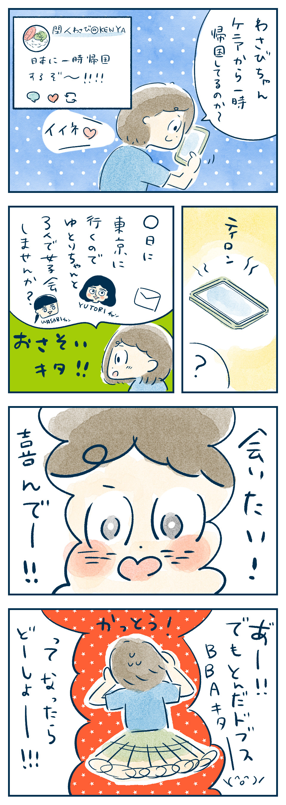 と、ケニアから帰国してくる閑人わさびちゃんが、ゆとりちゃんとのプチオフ会をするというので誘っていただきました。嬉しくて喜んでーと即答したあとに気付きました。己のコミュ障さと容姿コンプレックスに!