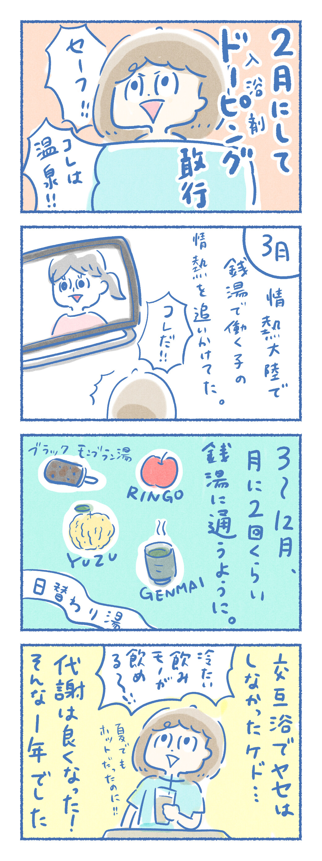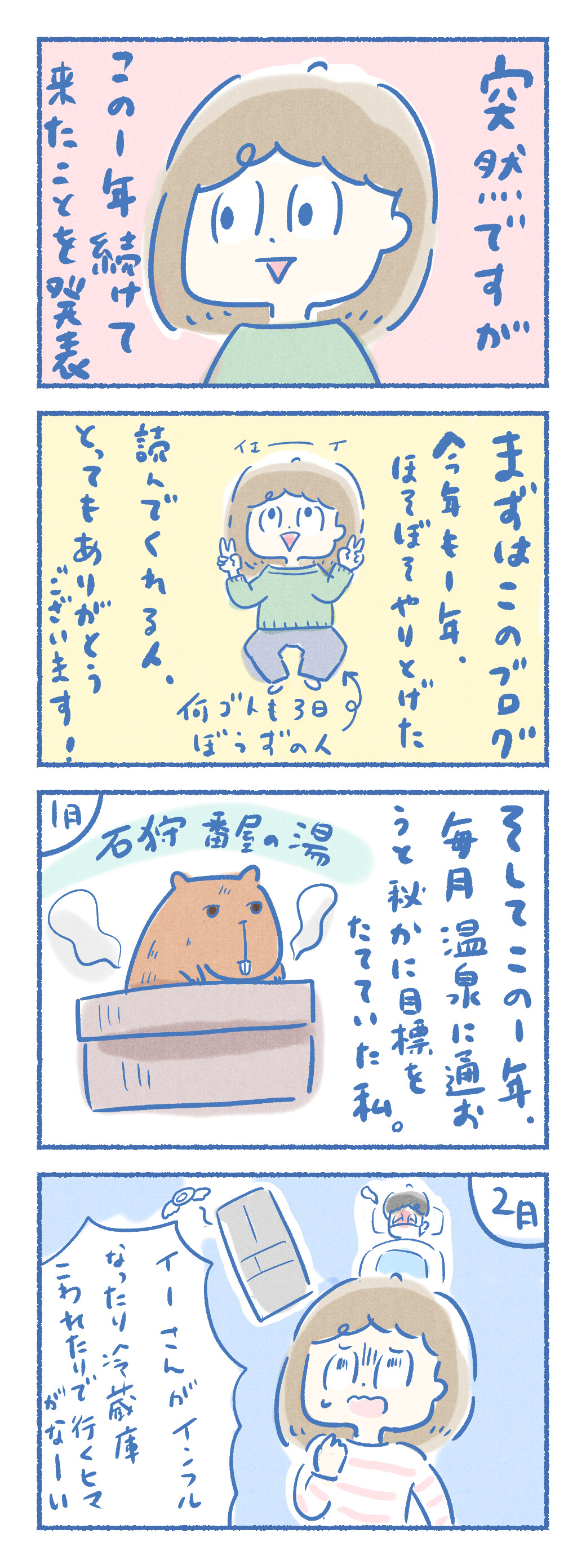 この1年続けてきたこと 2019年12月30日 14:24 今年もあと1日!ケガした話の途中だけれど、私の振り返りを…。2019年私はあることを秘かに続けてきました。銭湯にすっかりはまった1年でした。ブログもこの1年、無事になんとか続けられました。ひとえに読んでくれる人、交流してくれる人のおかげです。ありがとうございました。何事も3日ぼうずだったのに、今は描きたいこといっぱいあるのに技術がおっつかなくて描けないでいるそんな状態です( ^ω^ ) 来年もよろしくお願いします! 「夫婦の日常」カテゴリの最新記事 タグ :#銭湯 < 前の記事次の記事 > コメント コメントフォーム 名前 コメント 記事の評価 リセット リセット 顔 星 情報を記憶 コメントを投稿する