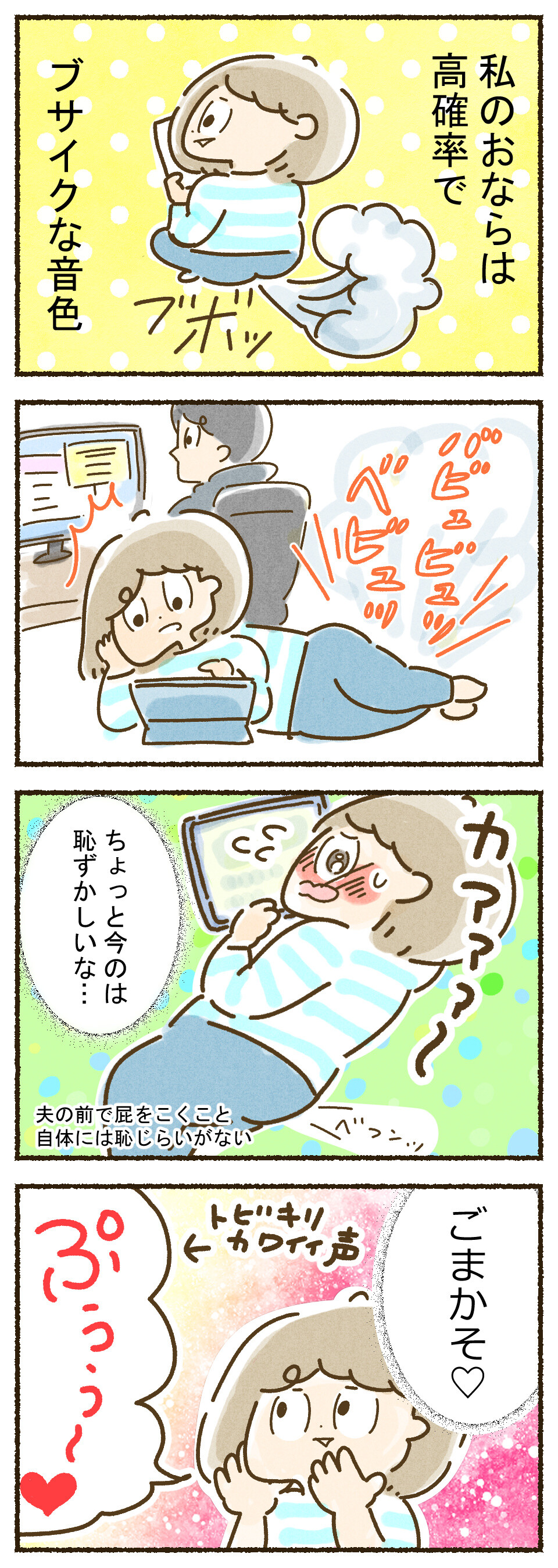おならをごまかしてみたら 2020年05月31日 21:00 こんばんは!本日はちょっぴりシモのお話です。そう、おならのはなし。it`s he!生理現象だから仕方ない!う~ん、ごまかされず!プーなんてかわいい音色が最近全く出ません。あと、夫の前だけです☆他の人の前ではしないよ!極力! 「夫婦の日常」カテゴリの最新記事 タグ :#恥の多い人生#メヲトーーク#ほのぼの#恥ずかしい話 < 前の記事次の記事 > コメント コメント一覧 (2) 1. めみ 2020年06月11日 13:23 バビュビュベビュっで鼻水噴くw 私もいつかおならを遠慮なくできるようになりたいです 0 サン がしました 2. サン 2020年06月11日 22:07 >>1 めみさんコメントありがとうございます(^o^) 鼻水噴く程w 恥ずかしい音が出てしまいました! めみさんが遠慮なくできる日を祈っています(^^) 0 サン がしました コメントフォーム 名前 コメント 記事の評価 リセット リセット 顔 星 情報を記憶 コメントを投稿する