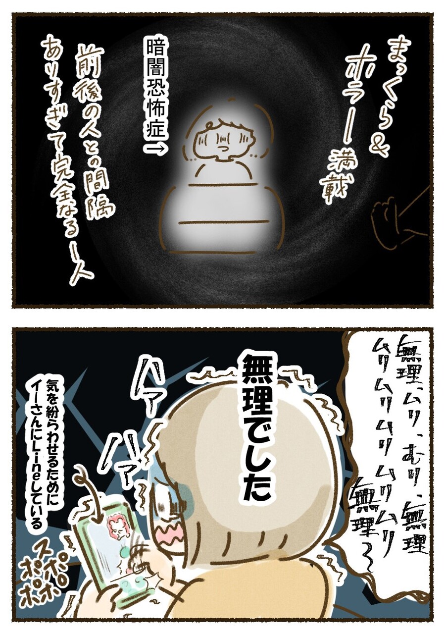 暗闇が苦手なのにめちゃくちゃ暗いし一人怖いし周り怖いものだらけでひたすら早く終われと祈り、ごくたまに見える先頭車両のお尻を心の支えにしてスマホの画面見て正気を保ちました。