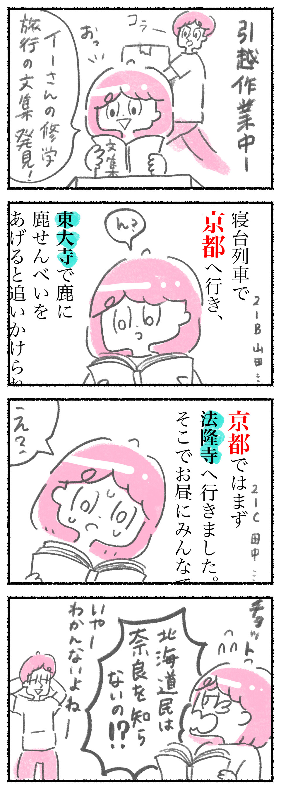 北海道民と奈良 2021年08月21日 12:00 いつもギリギリにならないと何もしないけど、今回は引越しの荷物詰めを今からちょっとずつはじめてます。 でも、細々としたモノが多くて終わる気がしない…。そして脱線ばっかり( ^ω^ )思い出の文集とか見つけたら読んじゃう。 東大寺も法隆寺も奈良だよ!北海道民の奈良への関心度無さすぎて笑いました。でも京都までは寝台列車で行って、そこからバスで移動したから県をまたいだことに気づかなかったらしい。そう言われれば仕方ない気もする。 「夫婦の日常」カテゴリの最新記事 タグ :#オモシロ夫婦集#北海道 < 前の記事次の記事 > コメント コメント一覧 (4) 1. 道民 2021年08月23日 07:55 私も修学旅行で奈良に行きました。ちゃんと奈良と京都の区別はつきますよ。道民だからじゃないでしす! 0 サン がしました 2. サン 2021年08月24日 14:01 >>1 道民さんコメントありがとうごさいます すみません、主語がでかすぎましたね。区別のつく道民の方がいて救われます! 0 サン がしました 3. 道民 2021年08月25日 15:03 こちらこそ変に強い言い方のコメントになってしまっていました。すみません。修学旅行で行った奈良は歴史の趣を感じるとても素敵な場所でした。 0 サン がしました 4. サン 2021年08月26日 18:30 >>3 道民さん、再びありがとうございます。全然、ご指摘いただけて良かったです。 奈良を素敵と言ってくださり感謝です 0 サン がしました コメントフォーム 名前 コメント 記事の評価 リセット リセット 顔 星 情報を記憶 コメントを投稿する