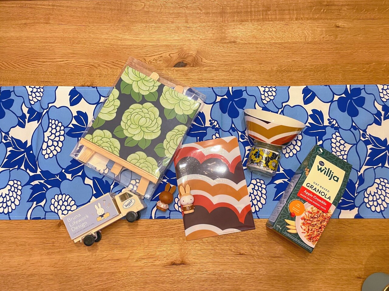 アンヌッカという花柄のテーブルセンターに、アートパネル、ボウルにクリアファイルが展覧会グッズ。展覧会グッズはたくさんありすぎてめちゃくちゃ迷った。完売品も多々あったみたいだけど、全部かわいかった。