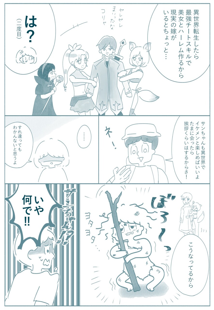夫と異世界転生と私② 2022年10月22日 18:30 前回からの続きです。異世界転生しても夫婦でいようねと言ったら、間髪入れず断られた妻…。どうやら夫には理想があるよう。夫は異世界美女とキャッキャしたいようだ!しかし妻は阻止するべく策を打ち出した!つづき↓ 「夫婦の日常」カテゴリの最新記事 タグ :#コミックエッセイ#絵日記#異世界転生#メヲトーーク < 前の記事次の記事 > コメント コメントフォーム 名前 コメント 記事の評価 リセット リセット 顔 星 情報を記憶 コメントを投稿する